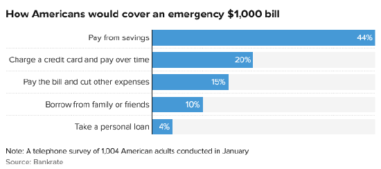 只有44%的受访美国人表示,他们可以使用储蓄来支付意外开支,而不是选择将其使用信用卡或向家人或朋友借钱。