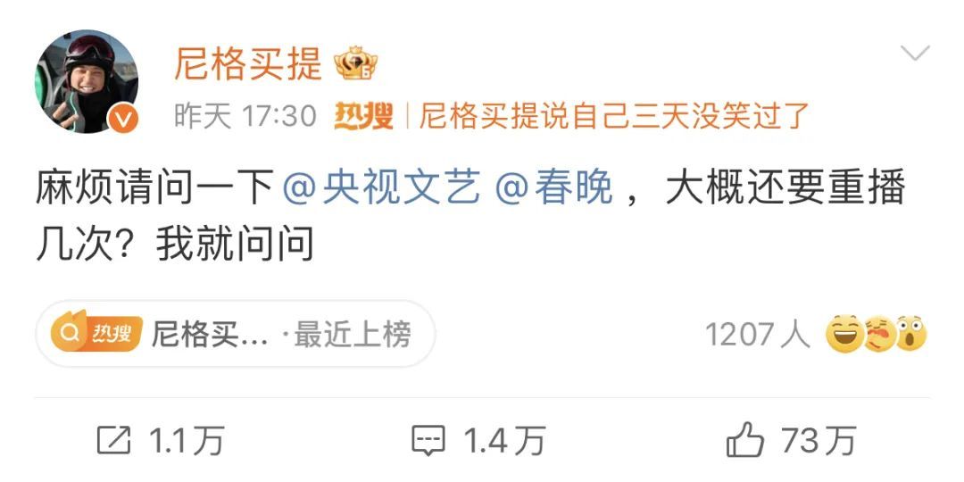 近日,“魔术失灵快碎了”的央视春晚主持人尼格买提,因一系列真实有趣的表情包走红网络,深受大众喜爱。2024年春晚结束了,但关于春晚讨论的热潮依然持续着,连日来关于尼格买提的话题多次登上微博热搜。
