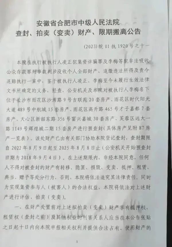 网传视频截图显示,房屋门口贴有安徽省合肥市中级人民法院的封条以及查封、拍卖(变卖)财产、限期搬离公告。公告显示,合肥中院在执行被执行人凌正犯集资诈骗罪及李梅等犯非法吸收公众存款罪刑事裁判涉没收个人全部财产、追缴违法所得及责令退赔执行一案中,鉴于被执行人凌正、李梅至今未履行生效法律文书所确定的义务,经查,公安机关及合肥中院对被执行人李梅名下位于长沙市的87房产进行预查封,并且附上了87套房产一览表。