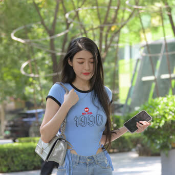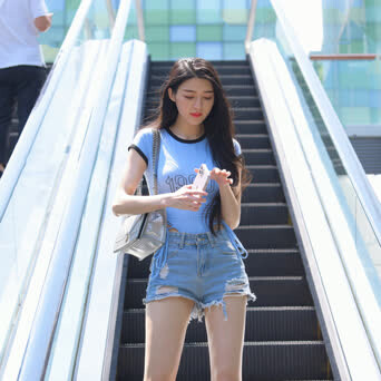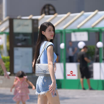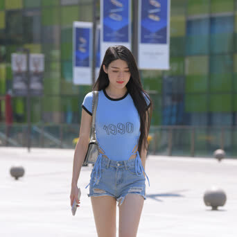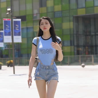 女孩身穿牛仔短裤秀出白皙的长腿,上身的性感T恤衬托着小蛮腰,简直太迷人。